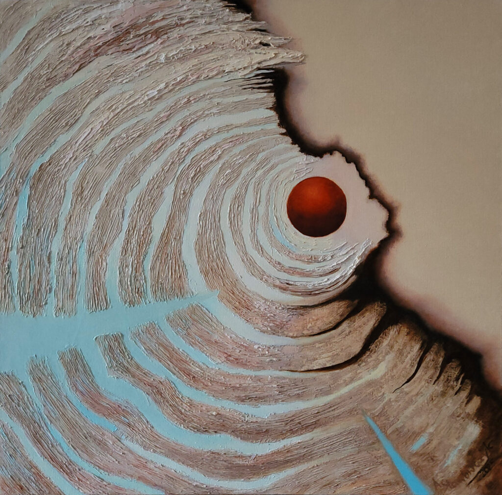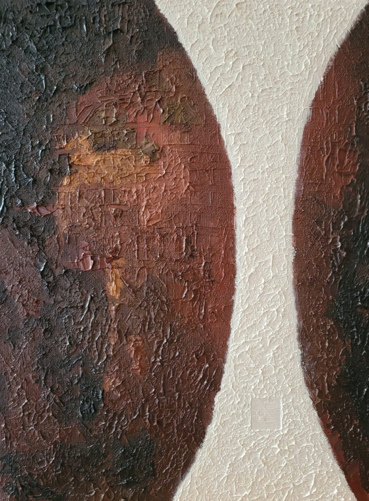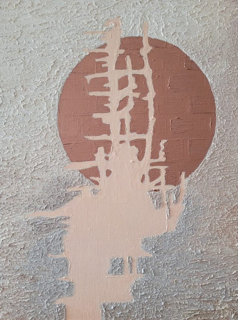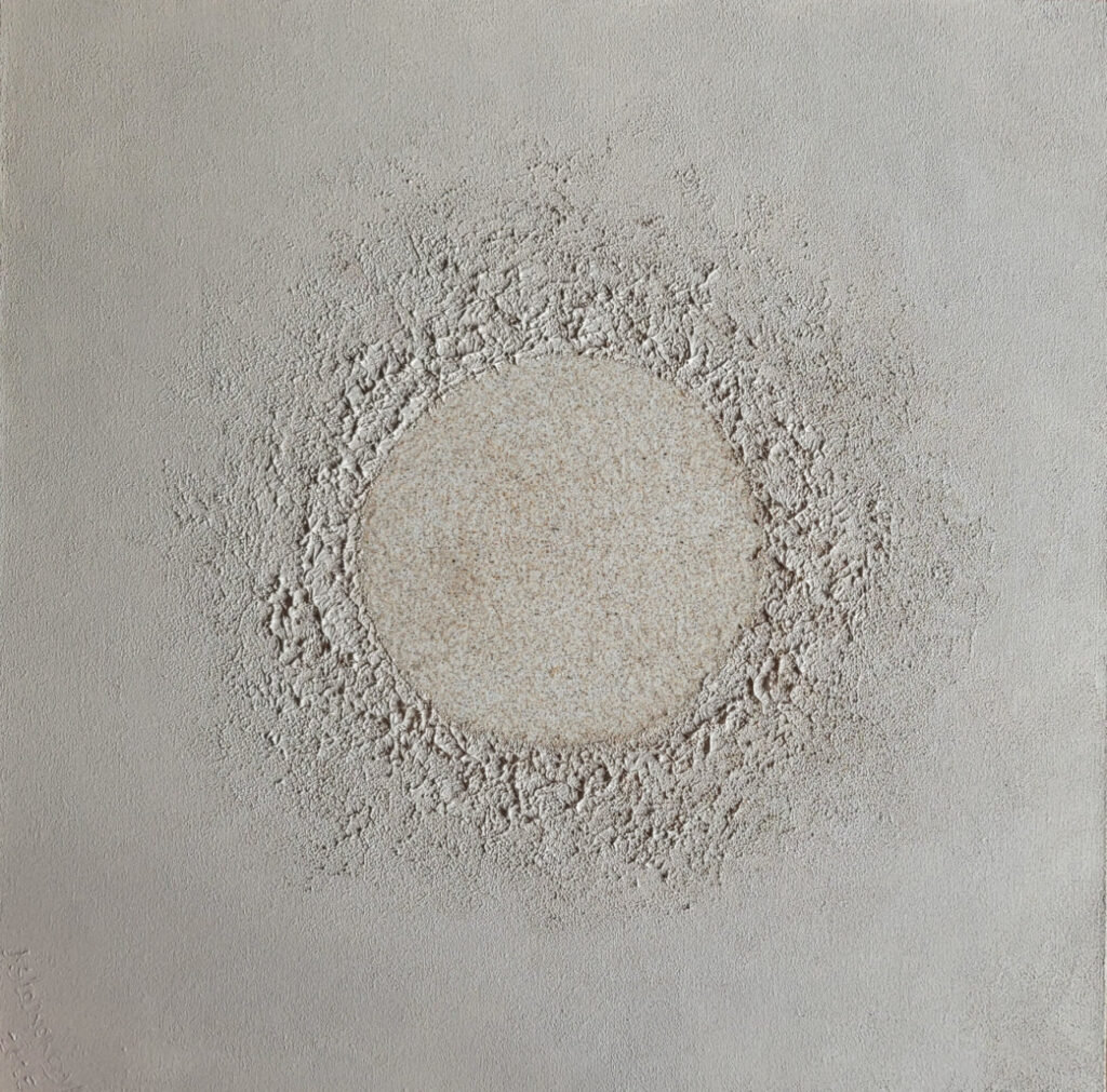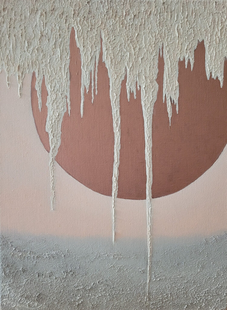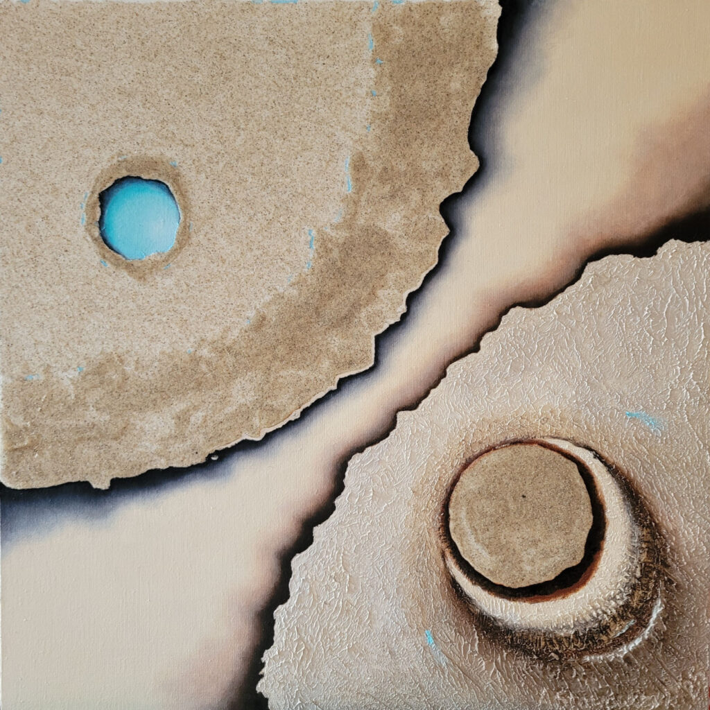 „Harmonia zmysłów” to zbliżenie się do natury. Inspiracją była podroż i podczas której doświadczyłam bogactwa odcieni piasków, ziemi, skał i wody. Zauroczona pięknem natury, przekształcam bezpośrednie wrażenia z obserwacji, w swoją wizję, dokonując syntezy w poszukiwaniu harmonii. Pozwala mi na to intuicja logiczna oraz odczuwanie na poziomie emocji. Tworząc ten cykl poszukuję harmonii, spokoju, ciszy i ukojenia czyli tego, czego na co dzień nam brakuje w szumie informacyjnym. Można mówić o pewnej formie medytacji. Wczuwając się w atmosferę danego miejsca inaczej odczuwamy patrząc, a inaczej zamykając oczy gdzie dominuje zmysł słuchu, węchu, dotyku, smaku. To samo miejsce odczuwamy na różne sposoby, w zależności od tego, na którym zmyśle się bardziej skupimy. Jeszcze inaczej odczuwamy starając się sobie przypomnieć nasze wrażenia i wspomnienia po czasie. Niektóre rzeczy są bardziej zatarte, a inne wyostrzone w pamięci. To wszystko jest zawarte w cyklu “Harmonia zmysłów”, który powstawał przez ostatni rok i na pewno będę go jeszcze rozwijać.